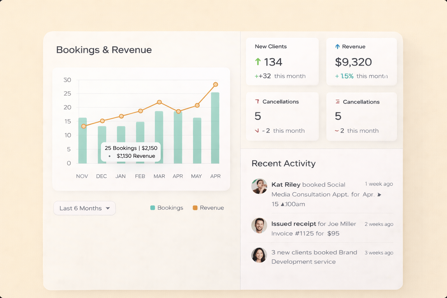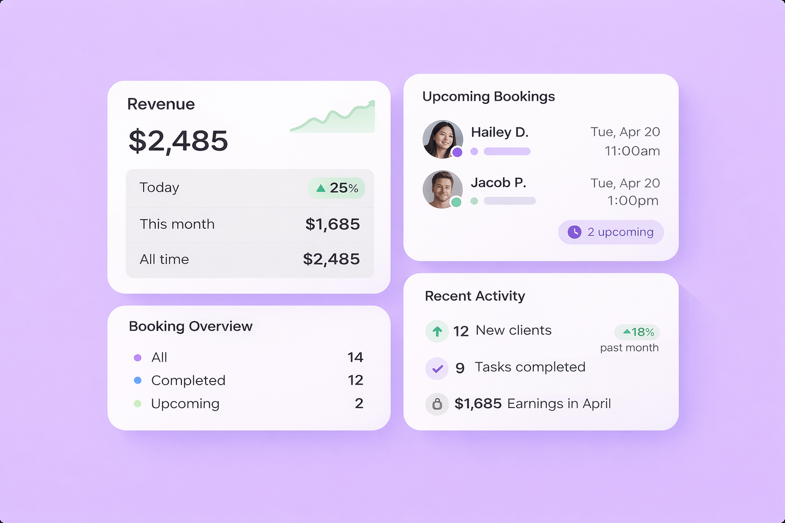 Get a clear snapshot of your business performance, upcoming activity, and key metrics in one place.
